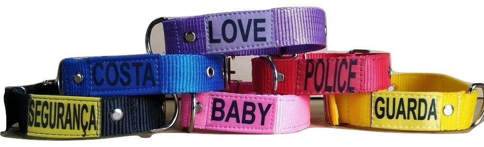 Coleiras personalizadas para seu pet. Confeccionadas em nylon, fita dupla SUPER REFORÇADA, acabamento de qualidade, regulável. Argola para encaixe da guia. Tamanhos P: PESCOÇO 26 A 34 CM Fita 25 mm M: PESCOÇO 32 A 43 CM Fita 38 mm G: PESCOÇO 35 A 52 CM Fita 38 mm GG: PESCOÇO 41 A 57 CM Fita 40 mm